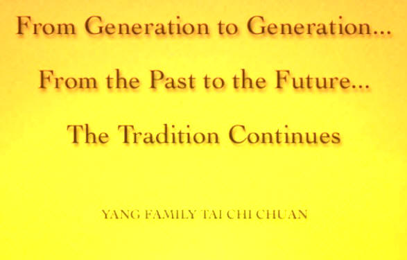 Vollends unhaltbar wird der Slogan bei dem gegenwärtigen Linienhalter Yang Jun. Wer bitte schön aus der früheren Generation hätte ihn unterrichtet? Wer würde seinen Vater als "Großmeister Yang Daofang" titulieren ohne sich lächerlich zu machen? Siehe die Rezension "Nebelkerzen um Großmeister Yang Daofang". Review: Yang Familie Yang Jun Yang Zhenduo Yang Daofang.