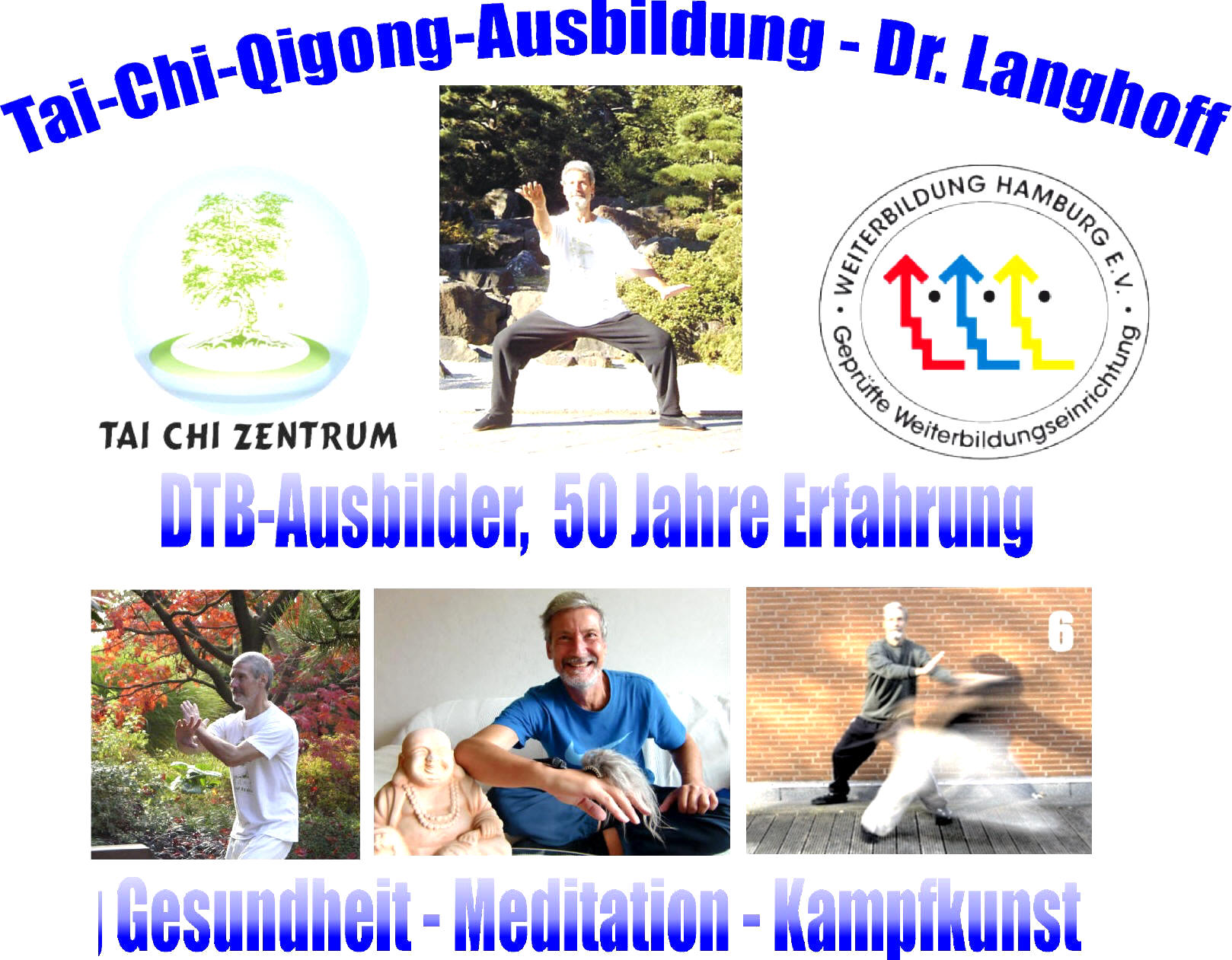Lehrerausbildungen im DTB-Zentralverband und den angeschlossenen Organisationen garantieren identische Standards - Dr. Langhoff berät vorabQigong-Tai-Chi-Ausbildung mit Prüfsiegel Weiterbildung Hamburg e. V. Willkommen beim DTB (Deutscher Taichi-Bund - Dachverband für Taichi und Qigong e. V.) und seiner zentralen Schulungsstätte, dem Tai Chi Zentrum Hamburg e. V. (gegründet 1989). Das Zentrum ist seit 1996 die deutschland-weite DTB-Schulungsstätte und trägt das Prüfsiegel des Weiterbildunng Hamburg e.V seit 1992. Der Beginn ist jederzeit überall möglich. Es arbeiten drei Verbände eng zusammen: Der Deutsche Taichi-Bund - Dachverband für Taichi und Qigong e. V. (DTB e. V.), der Tai Chi Dachverband Deutschland e. V. (TCDD e. V.) und der Qigong Dachverband Deutschland e. V. (QDD e. V.). |